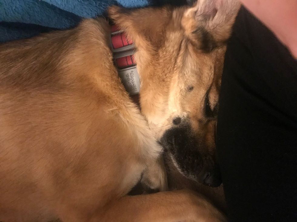 The biggest change was in how she physically interacted with us. Delilah was NOT (and still really isn't) a cuddler dog, and was very skittish about even one-armed hugs. Now, she's learned that hugs and snuggles are how we humans show our affection to her. She's learned to be okay with it, but will also make it clear when she's just not in the mood for snuggles.