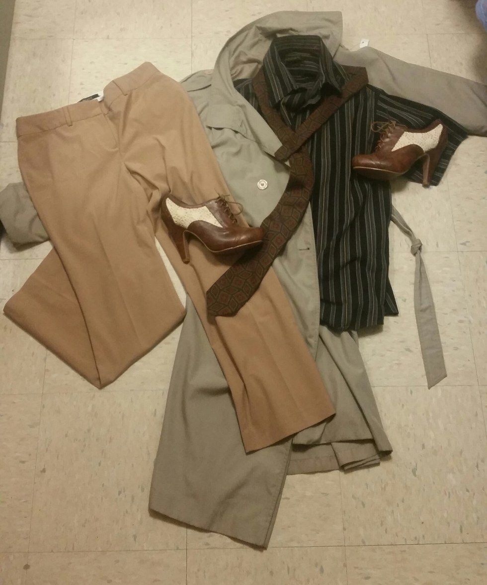 Lastly the choice was between finding a dressy vest and adding the leather jacket I already owned, or finding a green trench coat. I couldn’t find a vest, but I lucked out and found a sort-of-green trench coat that work well enough. In a perfect world I would have found one a little darker, but honestly it was everything I needed. This was the most expensive piece at $18, but was worth it.