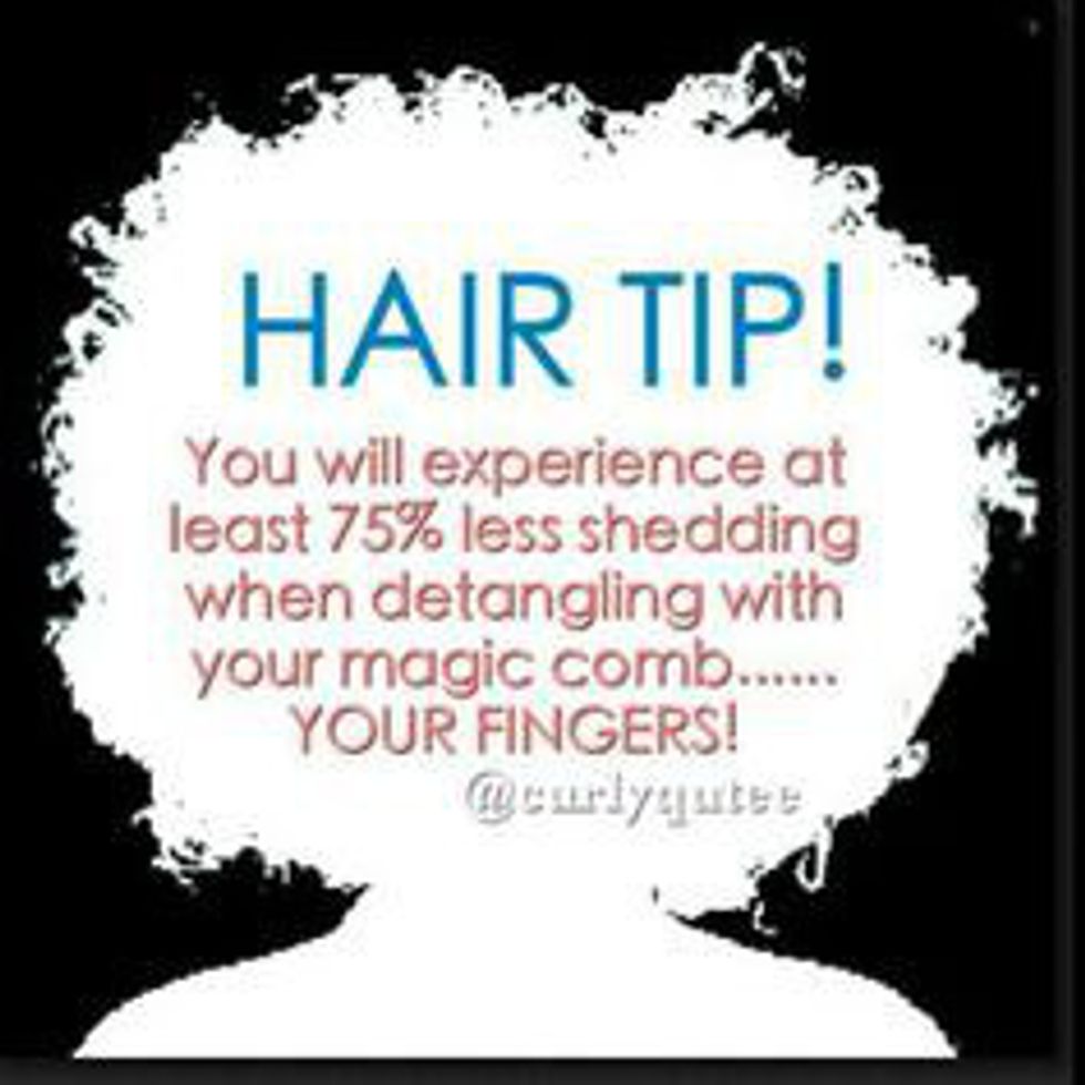 Before detangling your hair, it is essential to make sure that your hair is damp and conditioned. Brushes and small tooth combs rip your hair from the roots causing damage all over. To prepare to detangle, dampen hair after sectioning off. Apply an oil or conditioner of your choice to aid along the process. A key to this method is to make sure that you start from the tips of your hair and move upwards. Starting from the roots of your head and pulling downwards will only give you lots of tangles and lots of tears. Finger detangling is a great way to successfully detangle your hair without running a brush or a comb through it. Some people use this method as a first step to their detangling process, and then move on to running a wide tooth comb through their hair to ensure all knots are out, as finger detangling has been said to cause smaller knots.