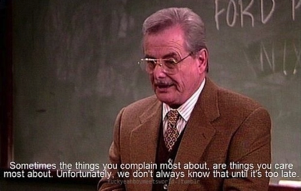 “Sometimes, the things you complain the most about, are things you care most about. Unfortunately, we don’t always know that until it’s too late.” Sometimes you don’t know what you had until it’s taken away from you, but then it’s too late. Appreciate the things that you own, the people that you have, and the knowledge that you have obtained. Live life to the fullest.