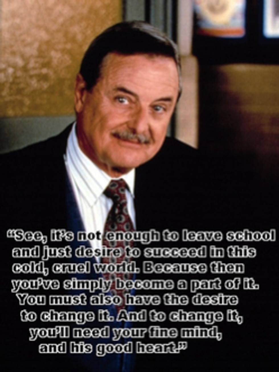 “See, it’s not enough to leave school and just desire to succeed in this cold, cruel world. Because then you’ve simply become a part of it. You must also have the desire to change it. And to change it, you’ll need your fine mind, and his good heart.”