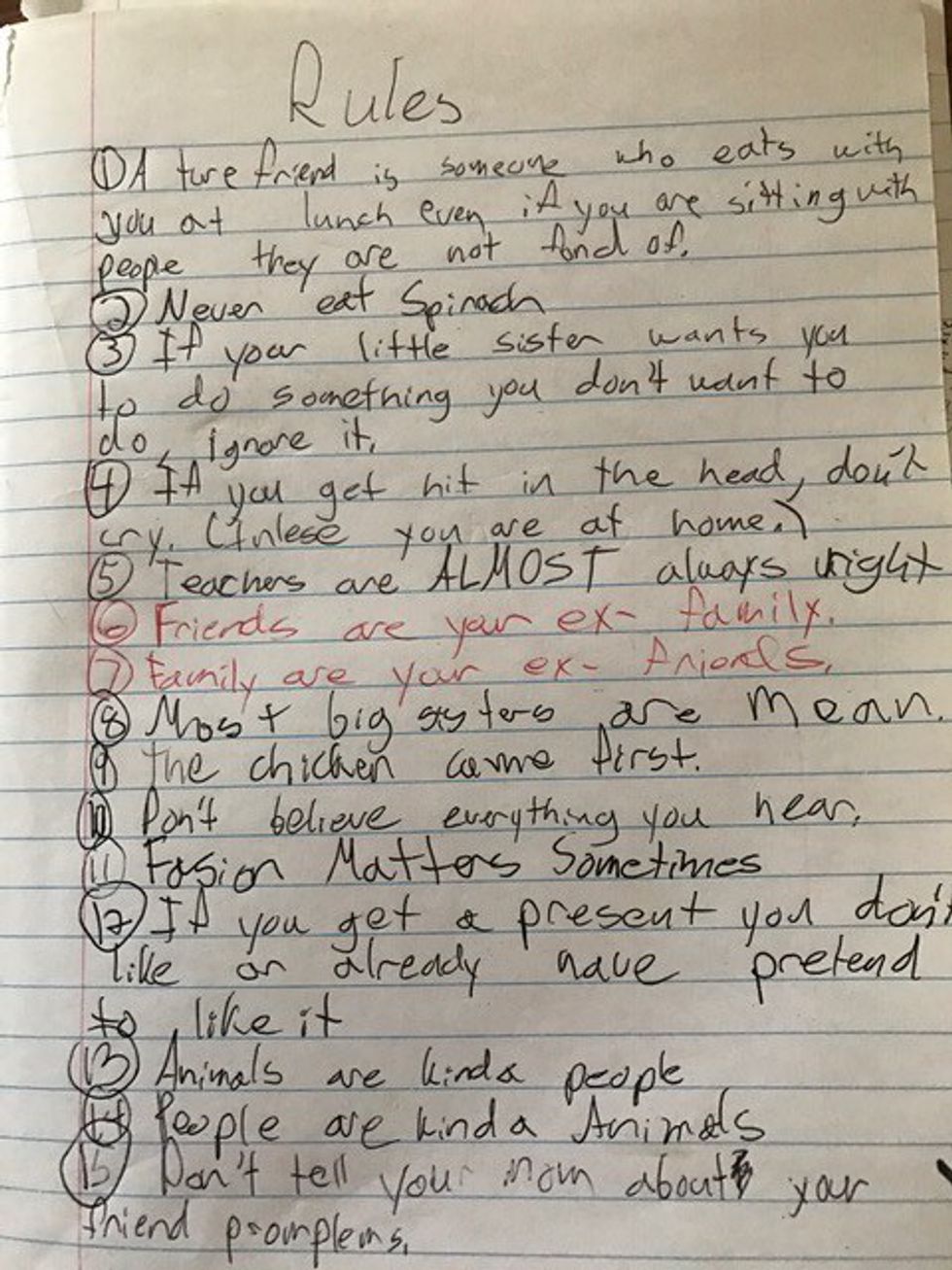 While my little sister was looking for a notebook to take back to school after winter break, she stumbled upon an old green composition book. The doodled on cover says "Mackenzie Burch WWPS 5B." Open in up and you're faced with the scribbled, large heading "Rules" followed by 15 life tips written by a me minus seven years. Some of them are typical 5th grader mentality like no. 3: "If your little sister wants you to do something you don't want to, ignore it," but some others still resonated with me today in a comical, kiddy-pool-deep way.