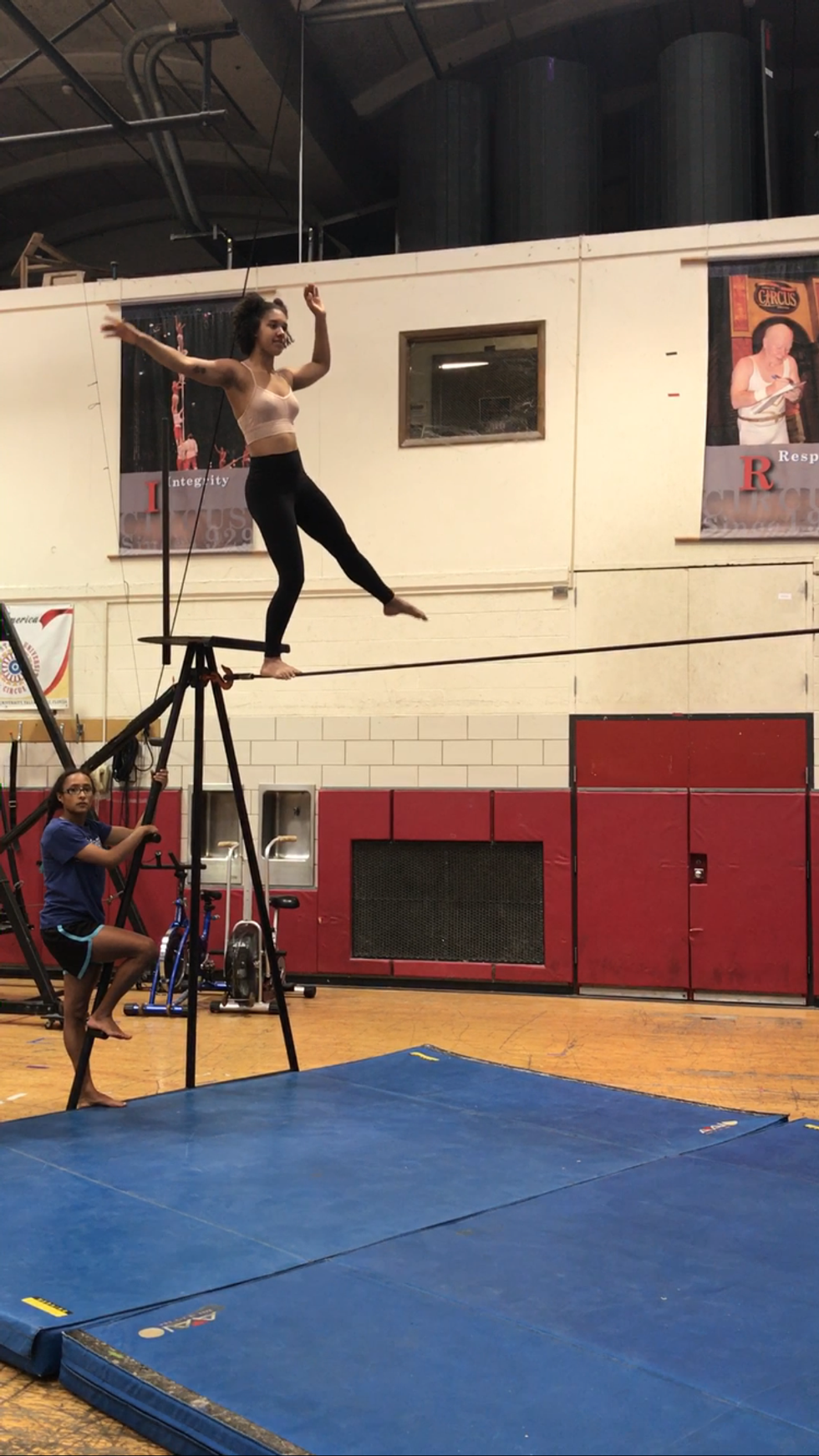 Last year, my first year, I got the chance to perform as an aerialist in the cloud swing act. With the goal of becoming a well-rounded circus performer, I decided to branch out and start training a few acts outside of my comfort zone this year. As an aerialist, that basically meant anything that's not tied to the ceiling. So, naturally, I decided to try tight wire-- our only non-aerial act that's still technically in the air!