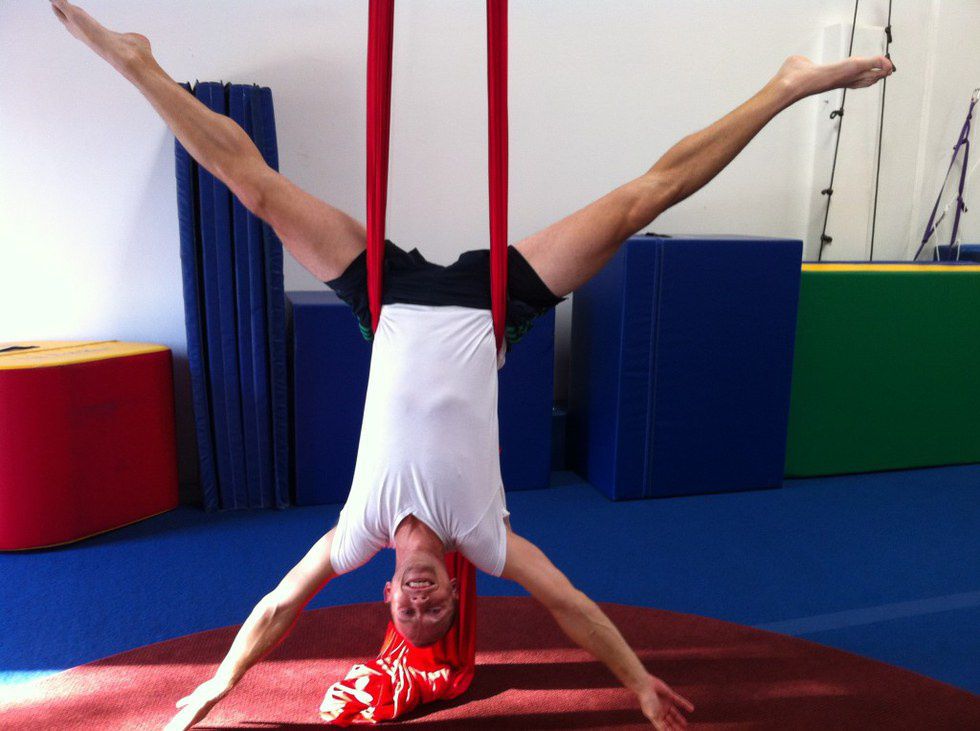 This is the first thing you will probably learn at a silks class. It includes leaning back against the silk and letting it support your waist while you hang upside down.
