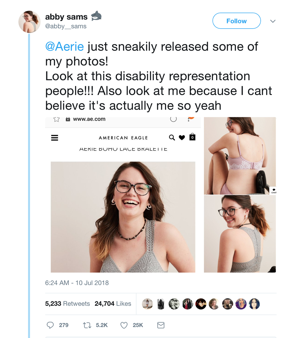 While all of these tremendous accomplishments have been made in the past 4 years, the #AerieReal initiative has reached another breakthrough when it comes to their newest inclusive ad campaign. The featured models, this time around, are shown embracing their chronic illnesses and disabilities. There's a model proudly wearing her ostomy. There's a model living with Type I Diabetes and sporting her insulin pump. There's also a model with Down Syndrome, and she has a smile that speaks volumes on her level of self-confidence. Abby Sams, a model featured in the campaign who uses a wheelchair, expressed her gratitude on Twitter for Aerie's inclusive efforts in a series of tweets.