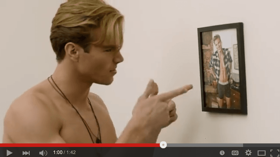 "I don't mind that I won't be retouched," says the guy with perfectly chiseled abs. "What defines a man is his character," says the same beautiful male model as he hangs a framed photo of his shirtless-self on the wall. Oh, the irony.