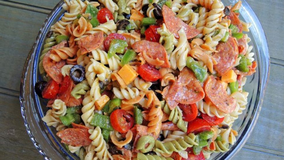 Pasta salad is a fresh and quick way to a fulfilling and healthy meal. Not only can it be eaten by itself, but can be paired with baked chicken, breaded chicken breast, seafood, or even pork chops. It is a healthy way to eat pasta, away from the traditional sauce and cheese ration, and the ingredients are very affordable. You can add or delete ingredients and make this dish tailored to your liking.