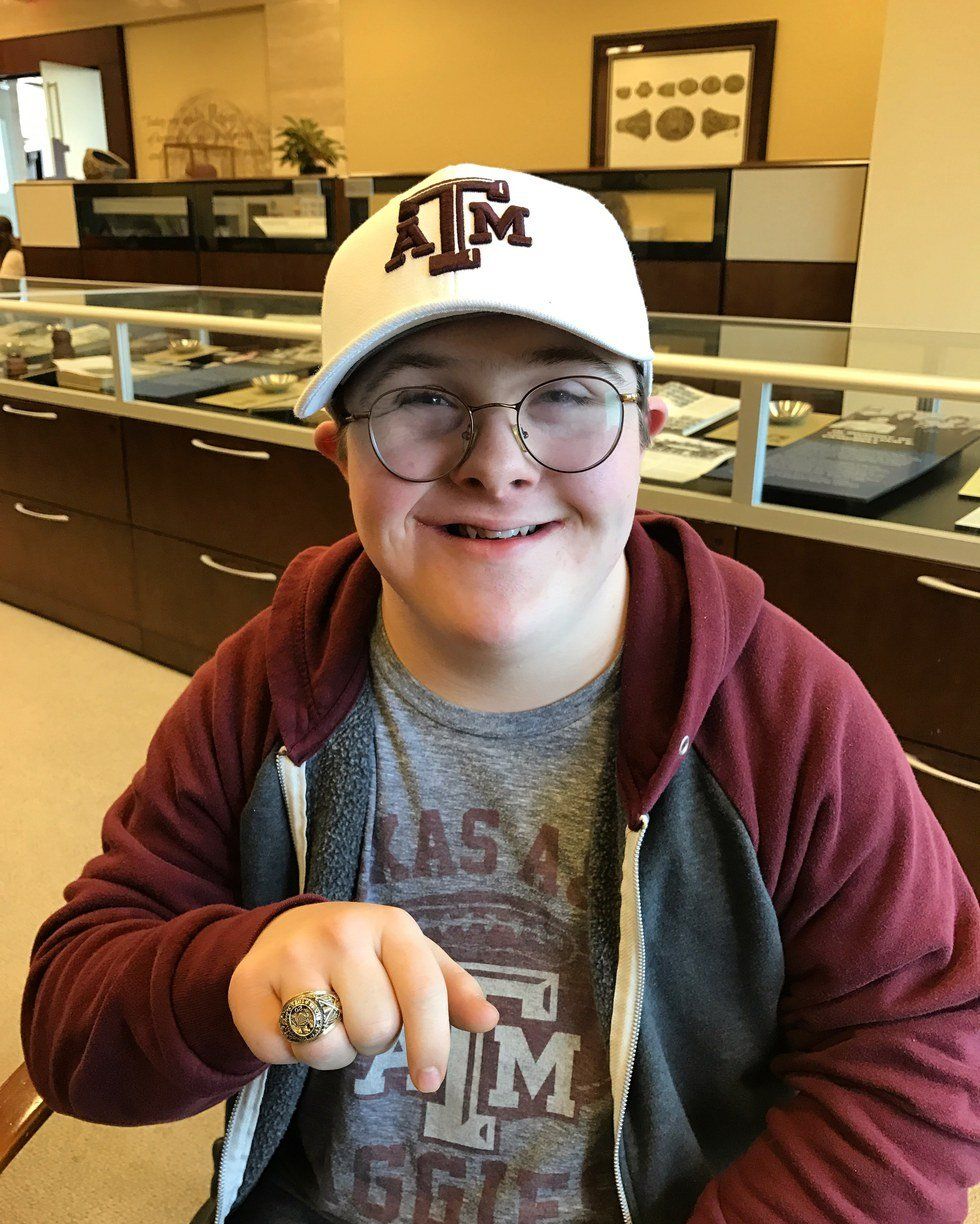 Up until now, I have left some important information out. Nicholas has Down syndrome. He is 18, soon to be 19, and he will never go to Texas A&M. However, I would not stand to hear anyone say that he is any less of an Aggie. He loves this school. He loves going to football games at Kyle Field. He loves singing the Aggie War Hymn, although he only knows the, "Sounds like hell!" part. He loves throwing up a gig 'em, and he wants Miss Rev to be his personal dog. Nicholas is an Aggie, and the fact that he is represents the inclusiveness of the Aggie family.