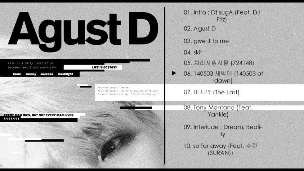 Mixtapes are something new to me, but a member from one of my favorite K-Pop groups BTS, Min Yoongi (AKA Agust D), dropped one this past Monday. He has been working on this project for two years, and finally released it to the public. It's been a long time coming, but it was completely worth the wait. He is known for being the most reserved member, but his lyrics and producing revealed his true self to the entire world. I am so inspired by this because that is what it truly means to be an artist. His influence has been shown through comments on YouTube and Twitter, where people have expressed their admiration for his sharing of something so personal. Some people assume rap is just rap, but it's poetry, and uses rhythm and sound to express what can't be told with plain words. Through BTS's music I have learned to appreciate rap lyrics and their personal meaning behind them. Another cool aspect that I want to do more research on is the translation between Korean and English. There are certain nuances that can't be translated and I would love to know more about how that influences the meaning of the lyrics to different listeners. The following is a track list breakdown of some of the most meaningful lyrics on the mixtape to me.