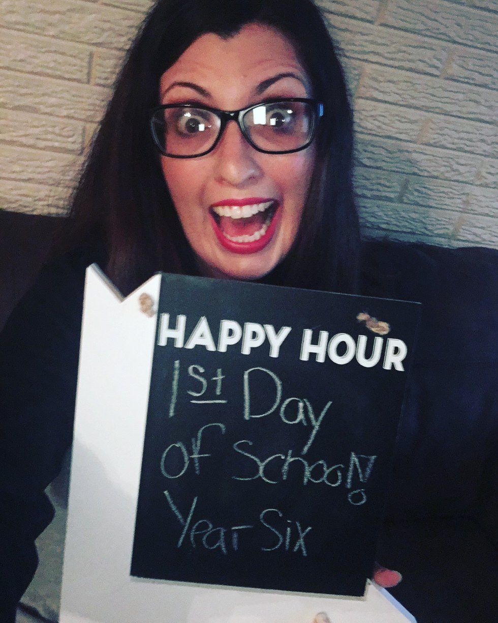 Look! Here I am at the beginning of the first day of school (yes, I'm aware that my chalkboard sign says "Happy Hour;" I'm awesome and professional).