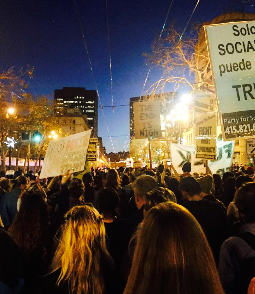 The day after he won, two of my friends invited me to come with them to the peaceful march on November 9th in San Francisco. I finally decided that now was the time that if I was ever going to become truly as involved as I'd like, this was the place to be. I met up with a large group of girls from my dorm who were all going to march, got on the bus, and tried to find the group.