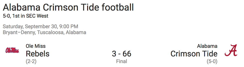 There are, however, some exceptions to this rule, like the 2017 National Championship game against Clemson (still upset about that) and the 2015 and 2016 games against Ole Miss. The majority of the other games have been blowouts.