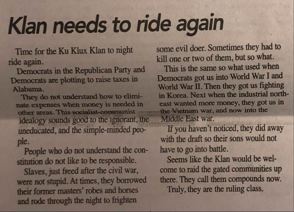 An editor and publisher of a small-town newspaper in Linden, Alabama, Goodloe Sutton, has caused chaos in the news world after he published the following article, essentially calling for a reunion of the Ku Klux Klan.