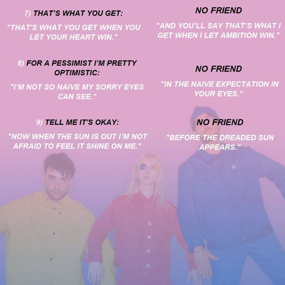 Next is "No Friend" which is actually the outro to "Idle Worship" with the instrumentals playing an inverted version of the chords from the original song. This song is so cool because Hayley doesn't sing on it at all, but there's still lyrics. The whole song is a spoken word piece performed by Aaron Weiss of the band mewithoutyou. He's not in Paramore but he's "speaking" a song entirely about the band and the issues they've faced over the years. The coolest thing about this song is all the references to old Paramore songs. Below is a graphic someone made on Twitter to all the lyric parallels.