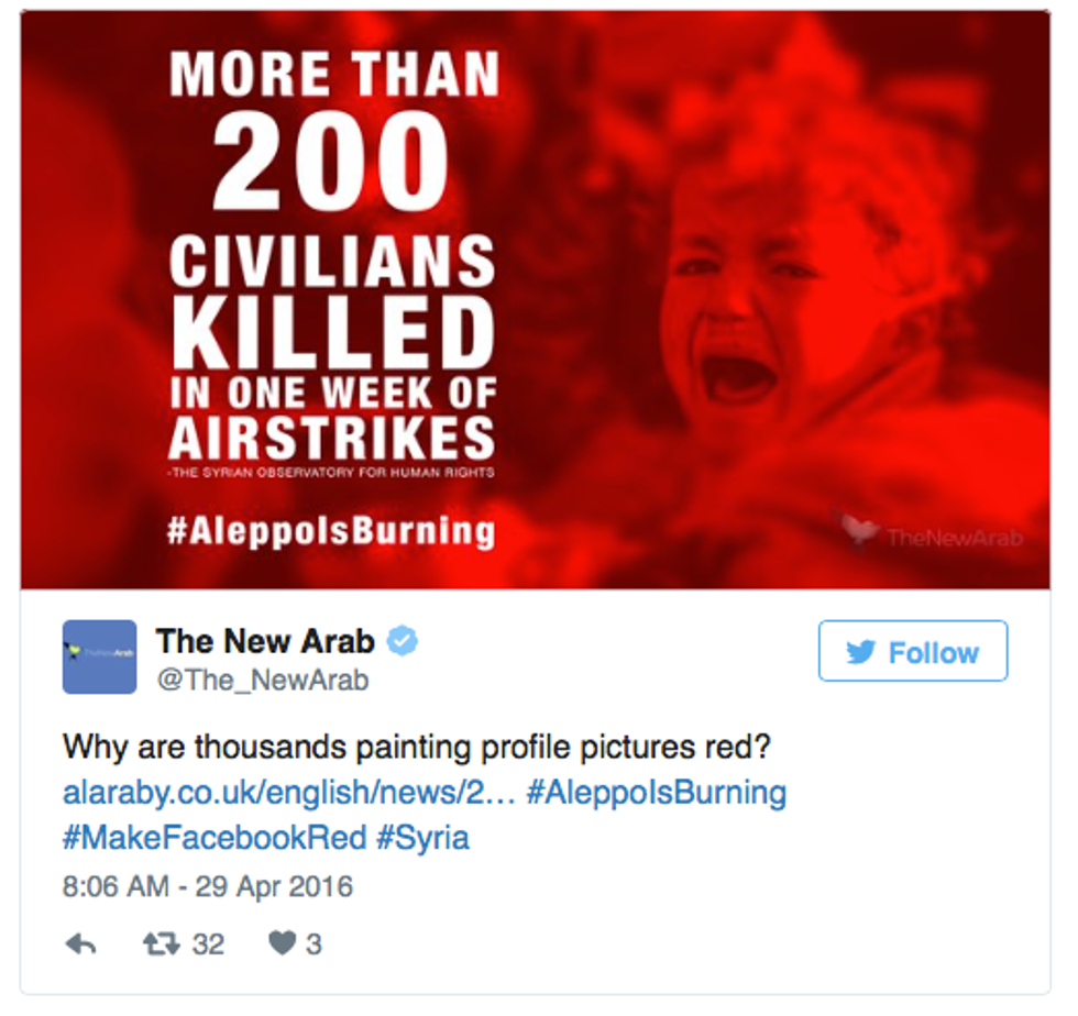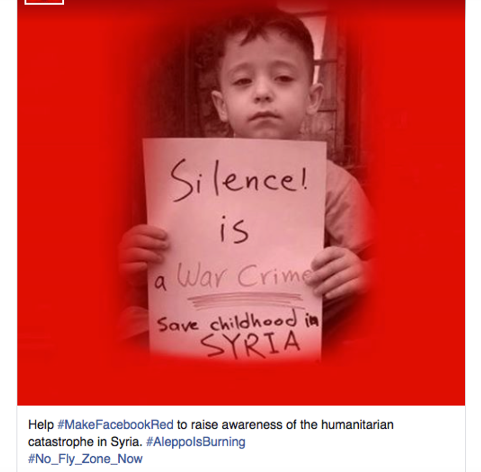 This past week, airstrikes devastated the city of Aleppo in Syria, particularly near medical facilities. There have been at least 200 people who are reported dead. As a result of this recent tragedy, Humanitarian groups are calling to #MakeFacebookRed, by encouraging users to change their profile pictures to red to recognize the lives lost to the five-year long carnage.