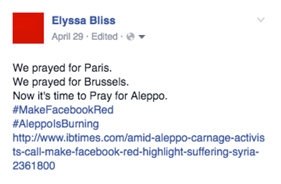 We prayed for Paris. We prayed for Brussels. Now it's time to pray for Aleppo. Make Facebook red. Aleppo is burning. Will you be the one to help me put out the fire?
