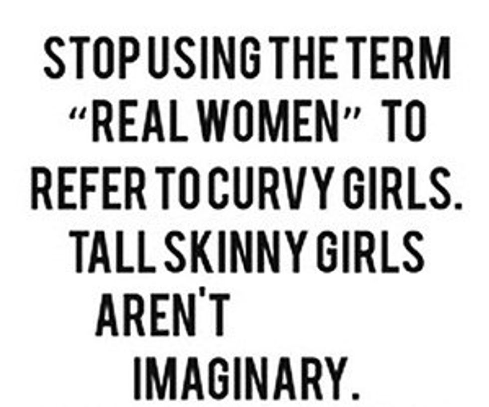 Body shaming is everywhere, and whether we admit it or not, we are all self-conscious. How could we not be? Everywhere we turn, there is a standard set for how we should look, how we should act and what we should wear. Fat shaming is a major problem in society, I could not agree more, but turning it around on other sizes isn’t helping anything other than poking holes in people's "body positive" speeches, like when people say, “All sizes are beautiful,” but then turn around and begin to talk about girls, saying things like, “Real men go for women with curves, only dogs go for bones,” or, “She’s so skinny she has the body of a 12-year-old,” or, “Why do you even work out?” or make ignorant comments like, “God, go eat a burger.” Let me start by saying that being skinny is okay and it is not something to be ashamed of. Be proud of your body no matter the size!