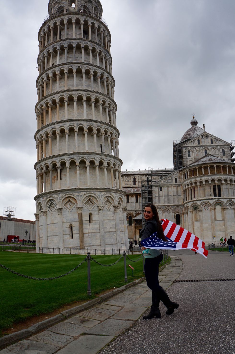 Across a very green lawn towards the back of the compound is the infamous Leaning Tower of Pisa. There is a fee to climb to the top which lots of people do. I did not. In my opinion, if a landmark is famous because it is about ready to fall over, there’s no way I’m going to climb it and help it lean even more. So instead, Hannah and I took pictures in front of it. In front of the tower, along the grass, there will be a line of people standing with their arms out pretending to hold up the tower. Just watching dozens of people do the exact same pose is quite entertaining. We chose to walk around to the backside of the tower where there were less tourists and more green grass. Here were some of the results.
