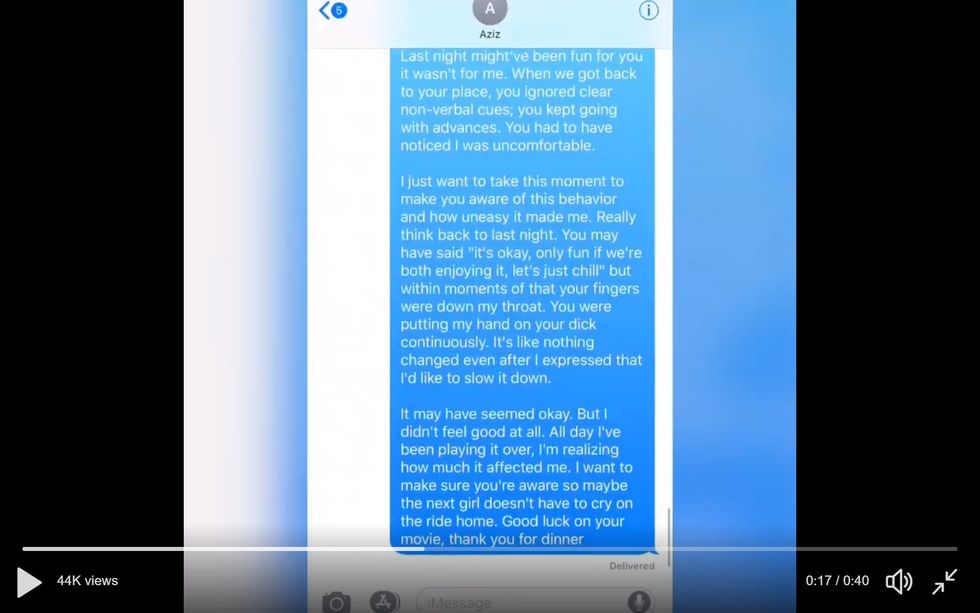 Thatās not what Grace had to say about their encounter. A text message from her to Aziz reads:
