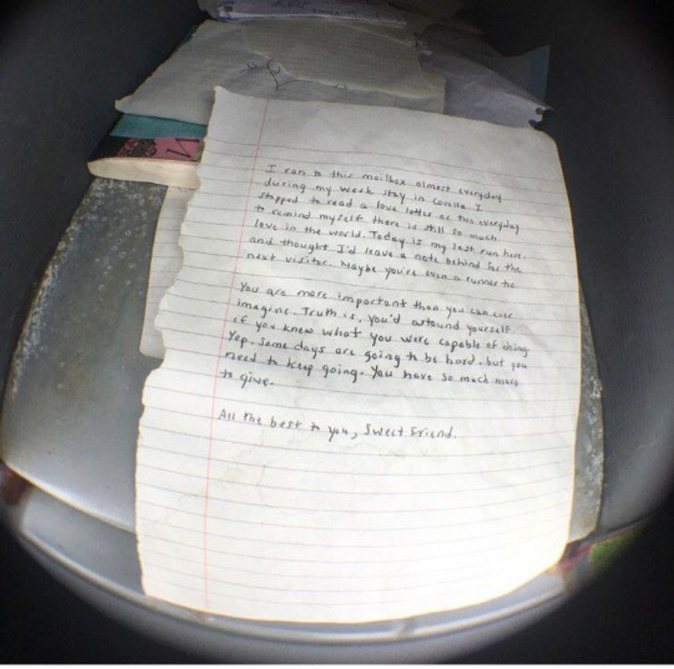 "I ran to this mailbox almost everyday during my week stay in Corolla. I stopped to read a love letter or two everyday to remind myself there is still so much love in the world. Today is my last run here and I thought I'd leave a note behind for the next visitor. Maybe you're even a runner too. You are more important than you can ever imagine. Truth is, you'd astound yourself if you knew what you were capable of doing. Yep, some days are going to be hard, but you need to keep going. You have so much more to give.