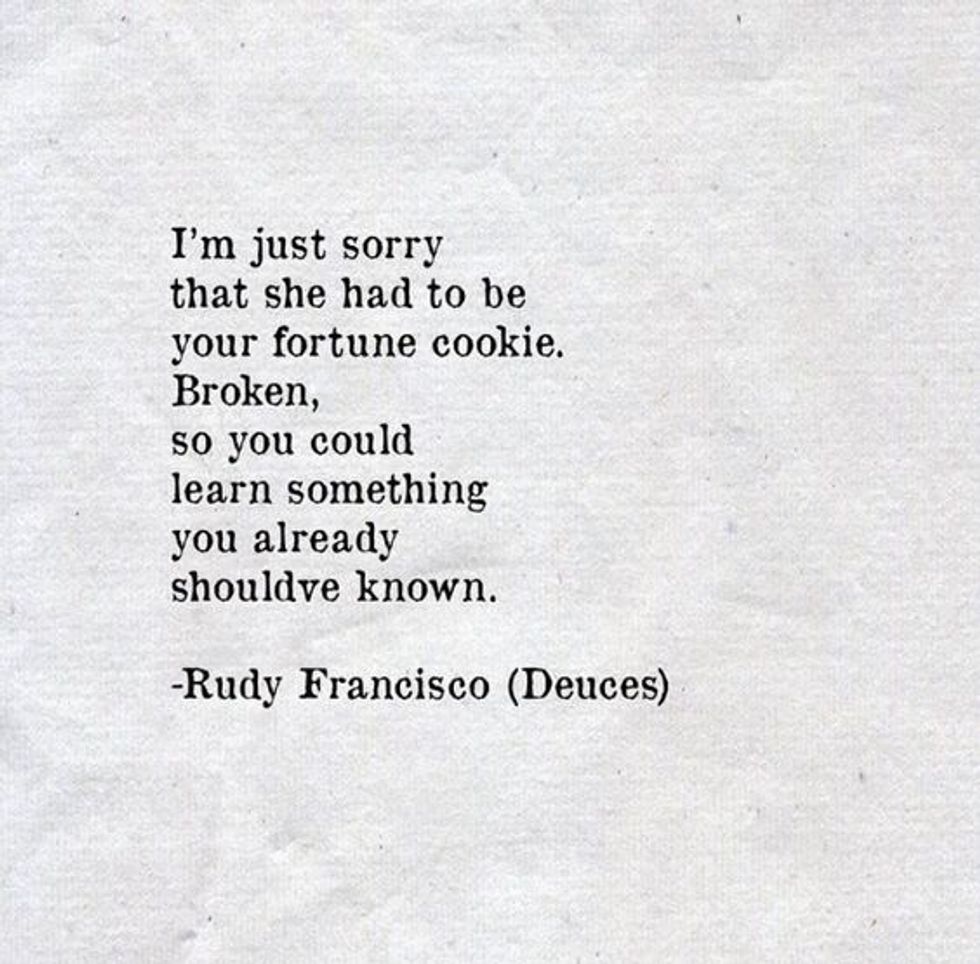 Francisco has developed a large Instagram following and his kind spirit and old soul exudes with every picture and poem he posts. His fans adore him and the way his sweet poems can put a smile on any reader's face. The beauty behind Rudy Francisco is his unique ability to touch on serious and relevant topics in such simple words. He has even won several poetry slam championships. Francisco's book is entitled Getting Stitches and consists of sixteen short poems.