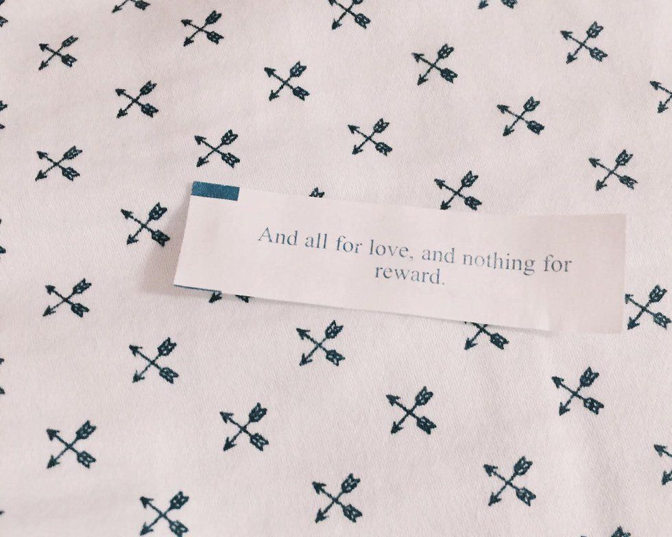 One night, my two best friends and I ordered Chinese take-out and one of my friends broke open her fortune cookie to find a simply fascinating fortune tumble out. It read in tiny, inky blue print: "And all for love, and nothing for reward."
