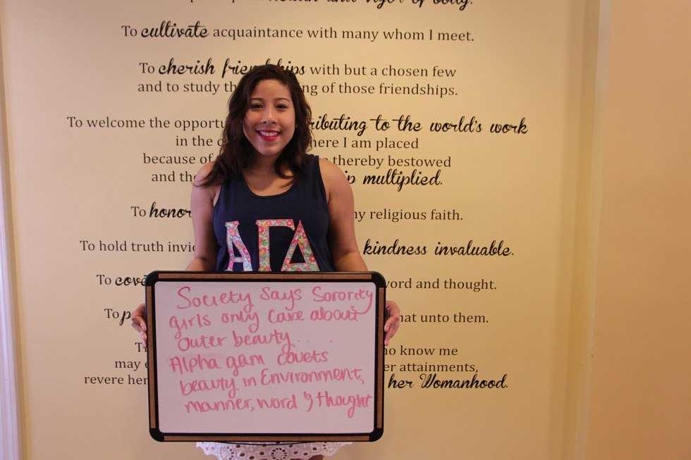 Each sorority is beautiful in their own way. But the main point is we all share bonds of sisterhood, we lift our members up, and we devote ourselves to creating a better world that we live in. No matter the letters, we are all Greek. Our founders worked hard to create something beautiful that we work hard to continuously grow and maintain. Society can say whatever they want to about Greek life, but until you live it, there is no reason to slander the organizations that binds us together. Society says sorority girls only care about outer beauty — Alpha Gam covets beauty in environment, manner, word, and thought.