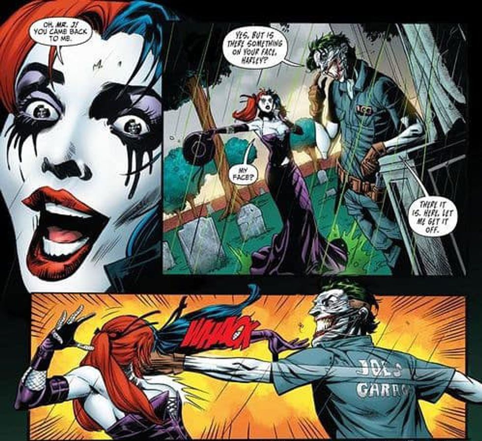Look up “The Joker abusing Harley Quinn” on Google and you will discover pages of comic book clips showing just that. The gruesome images are there. No one is denying that.