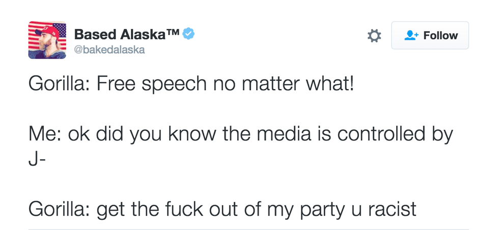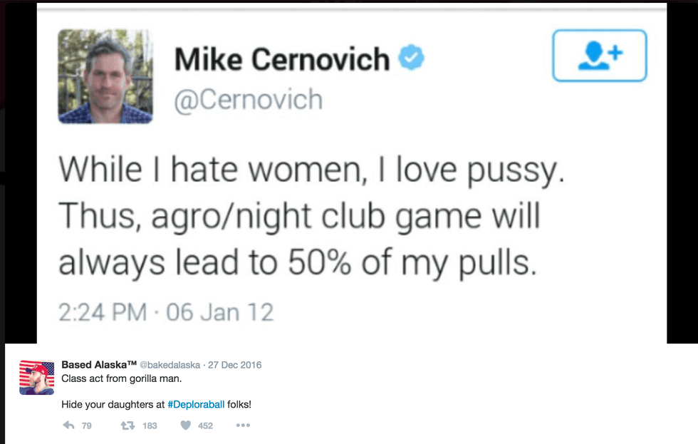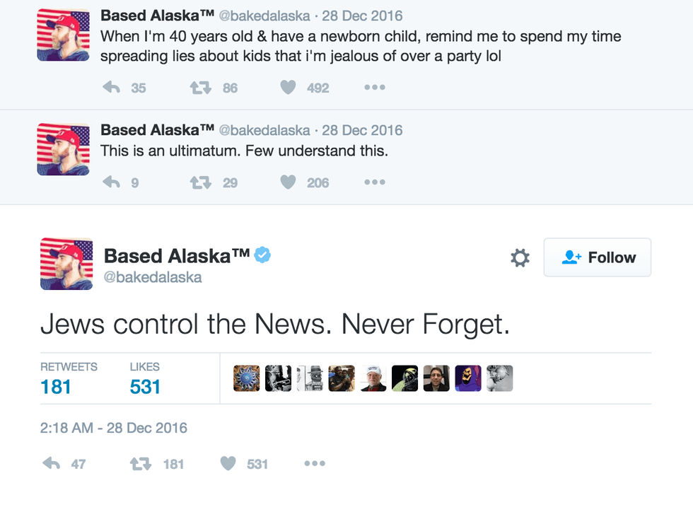Anglin and Spencer are not the only Neo-Nazi’s making headlines recently. Tim Treadstone, known as Baked Alaska on Twitter, was banned from the Inaugural ‘Deploraball’ after posting anti-Jewish tweets.The Deploraball was created by alt-right Trump supporters, the title is a jab at comments made by Hilary Clinton, calling Trump supporters “a basket of deplorables.” The cocktail event has sold nearly 1,000 tickets thus far, with prices ranging from $99-$2,500. It is scheduled to be held January 20th in honor of Trump’s inauguration. Treadstone was originally on the planning committee until the rift. Mike Cernovich, also prominent alt-right figure known for his misogynist comments, posted then promptly deleted a Periscope video explaining why Treadstone was disinvited from the event. In it, he called Treadstone a “druggie” and a “disgruntled employee” who had a “meltdown online.”