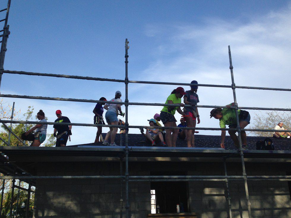 Waking up was a little more difficult after our busy Tuesday. One of my friends and I switched jobs so I worked with the hospitality group which was two older women named Jean and Barbara. They are called “Care-a-Vanners” because they live in an RV, traveling the United States for months at a time, helping at various Habitats. Together, we sorted the dozens and dozens of shirts in one of the storage units. We also created a clothesline to help dry some of the shirts that seemed damp. Part of hospitality included making sure those of the students and adults working near our site were kept hydrated so we handed water and Gatorade up a ladder to the super-hot roof workers.