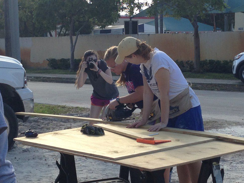 Wake up call was about 6 AM, but like the drive down, we were pretty excited about our first day on the work sites so getting up wasn’t too hard. We got to our meeting place and signed in. There were two other college groups in our Collegiate Challenge so after they arrived, we went to a big field in the back of the house and formed a circle. The site leaders talked for a few minutes and did introductions, then we said a prayer (Habitat is a Christian organization but they do not discriminate). Our theme or phrase for the week was “it’s not a hand out, it’s a hand up!” We split up into several work crews. My group went to a house several streets away, where I spent the morning building picnic benches for lunch, pulling nails out of concrete and chipping away excess concrete around the base of the house. After lunch we cleaned up our sites and headed back to our campground. Once we got back to our cabins, most of us changed into bathing suits and headed to the beach. Several of us played a hilariously horrendous game of volleyball on the beach. That night we went into the downtown area nearby and ate at a pizza place and then walked around for a while after we finished. With all of our hard work and many hours in the sun, we all fell asleep quickly.