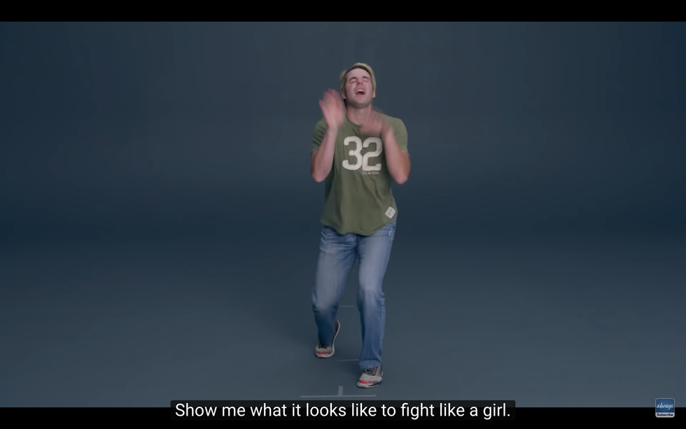 A TV advertisement that is an element of the #LikeAGirl campaign consists of someone behind the camera asking women, men, and boys to "run," "fight," and "throw" like a girl. Snippets of respondents acting weak and prissy are shown.