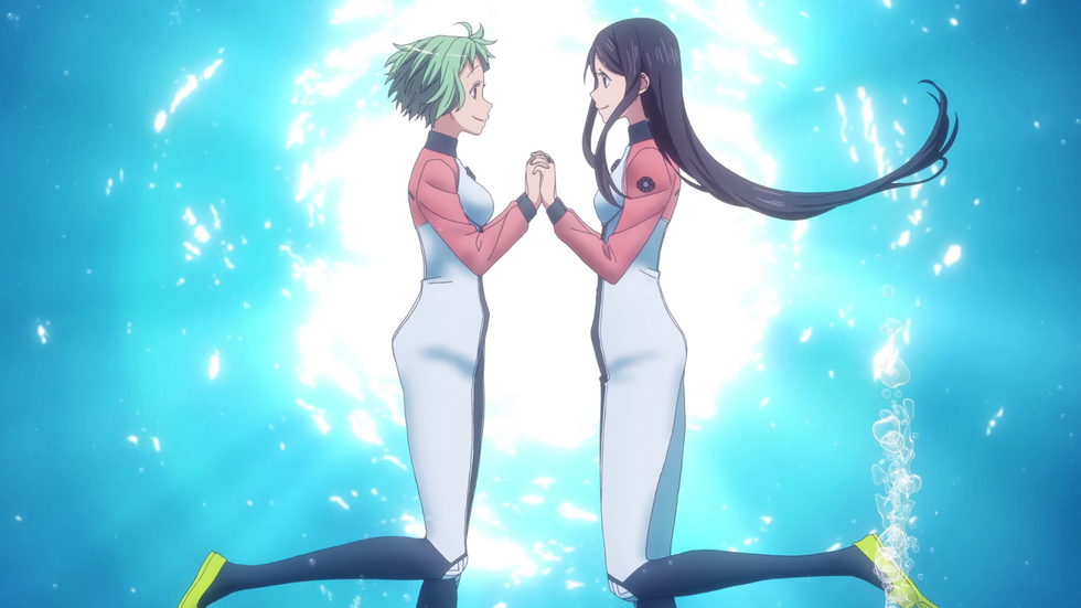 The story follows 15-year old Futaba Ooki, an introverted girl who just moved from Tokyo to this small island on the Izu peninsula. The next day she starts high school, where she’s understandably anxious. New school, new town, new people all of it can be overwhelming. At the school, she meets Hikari Kohinata, an extremely enthusiastic and outgoing girl. From there a beautiful friendship (and something more) blossoms. Hikari (nicknamed Pikari) shows Futaba (nicknamed Teko) around and takes her to show off her favorite thing to do: scuba diving.