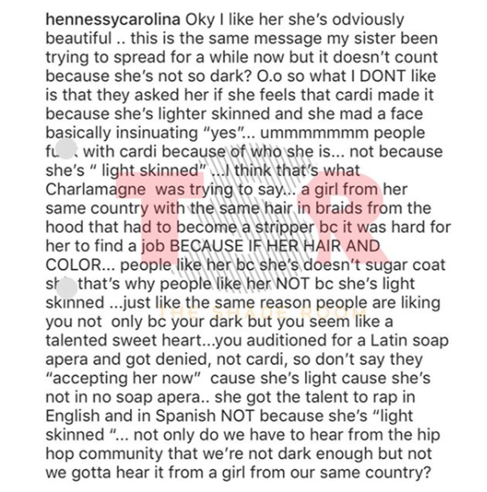 From there the situation got messy and unfortunately Cardi B's, younger sister felt as if her big sis needed some sort of defending in this non-attack. Hennessy Carolina posted this underneath a clip of Amara's interview on "The Breakfast Club's" Instagram page, and then later deleted it (after a sea of people explaining to her the concept of colorism and that Amara said nothing to discredit Cardi, no doubt.)