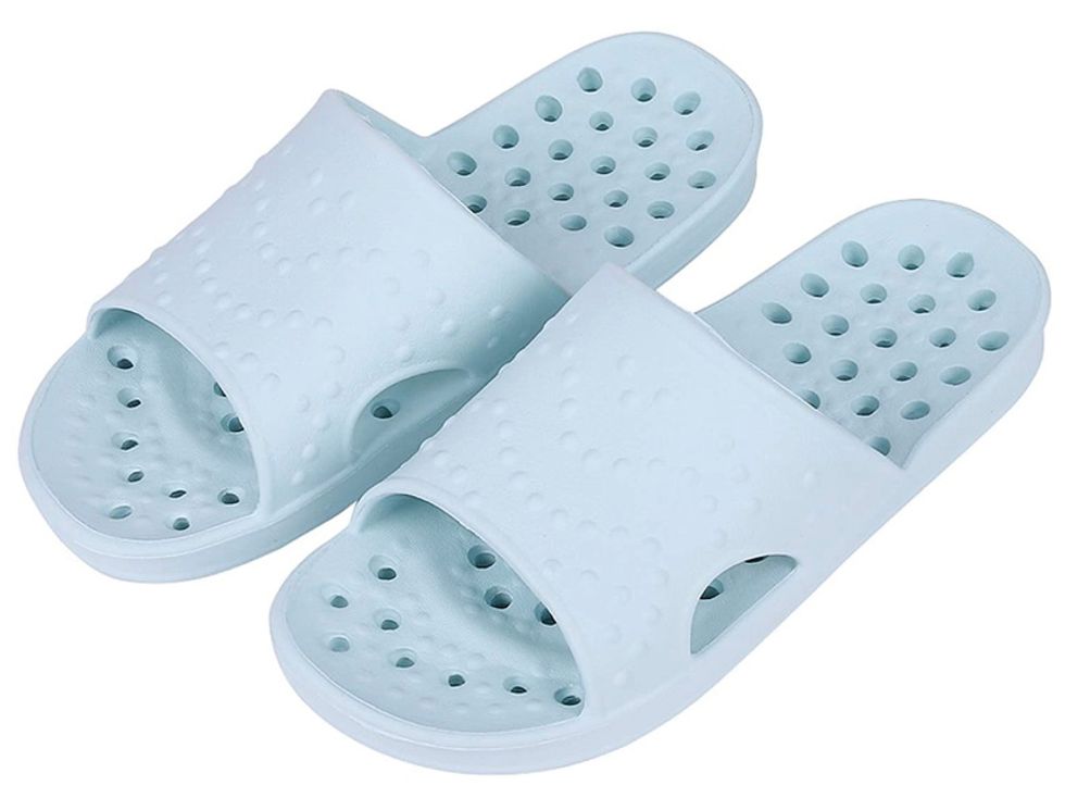 White shower shoes are preferred but not a requirement. Anything with holes will dry quickly.