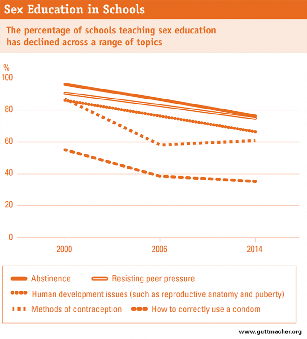 According to Guttmacher.org, 88 percent of schools allow parents to keep their kids from sexual education information. At the middle school level, only 10 percent taught children to use a condom as a part of required instruction. Thirteen states teach medically accurate education. Thirteen also require discussions of sexual orientation, but four of which require that only negative information is presented.