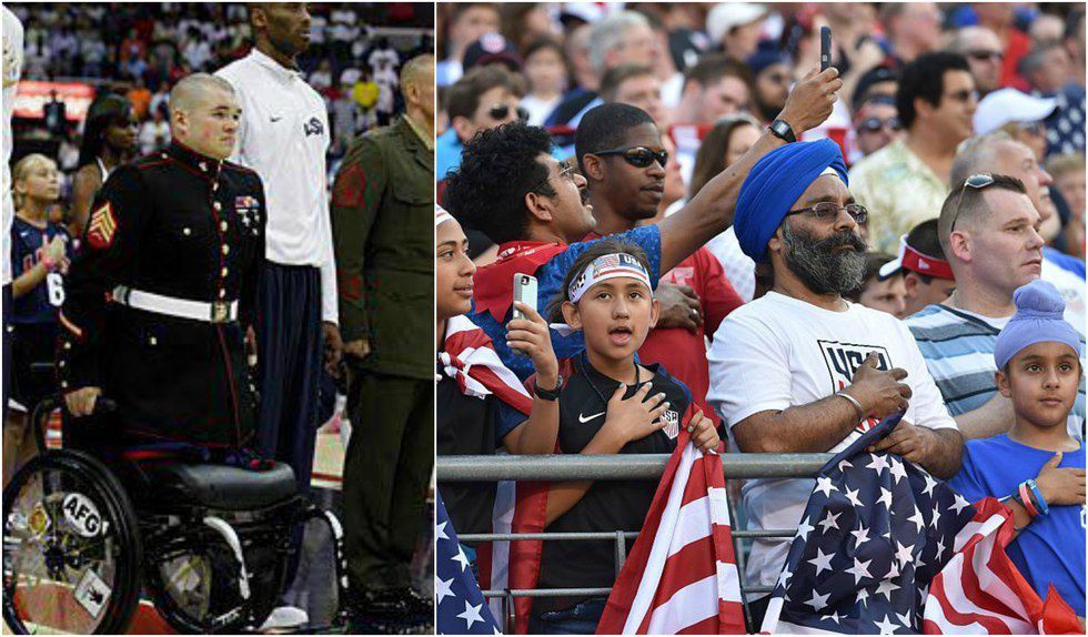 It is your right whether to stand or not, but above is a Marine, who can't stand, defending for your right.