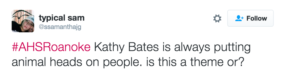 Picking up where the premiere left off, the second episode began with the human sacrifice that felt a little too familiar. Before setting her victim ablaze over a primitive barbecue spit, Bates put a dead pig’s head on him in a move that echoed Madame LaLaurie, her “Coven” character who tortured her own victims and forced one to wear the head of a bull.