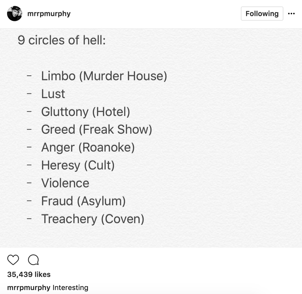 However, Ryan Murphy’s “interesting” response to the fan theory is not exactly a confirmation, per se. His confirmation came about on his Instagram when he posted an iPhone-typed, heart attack-inducing picture of how each season matches a circle of Hell.