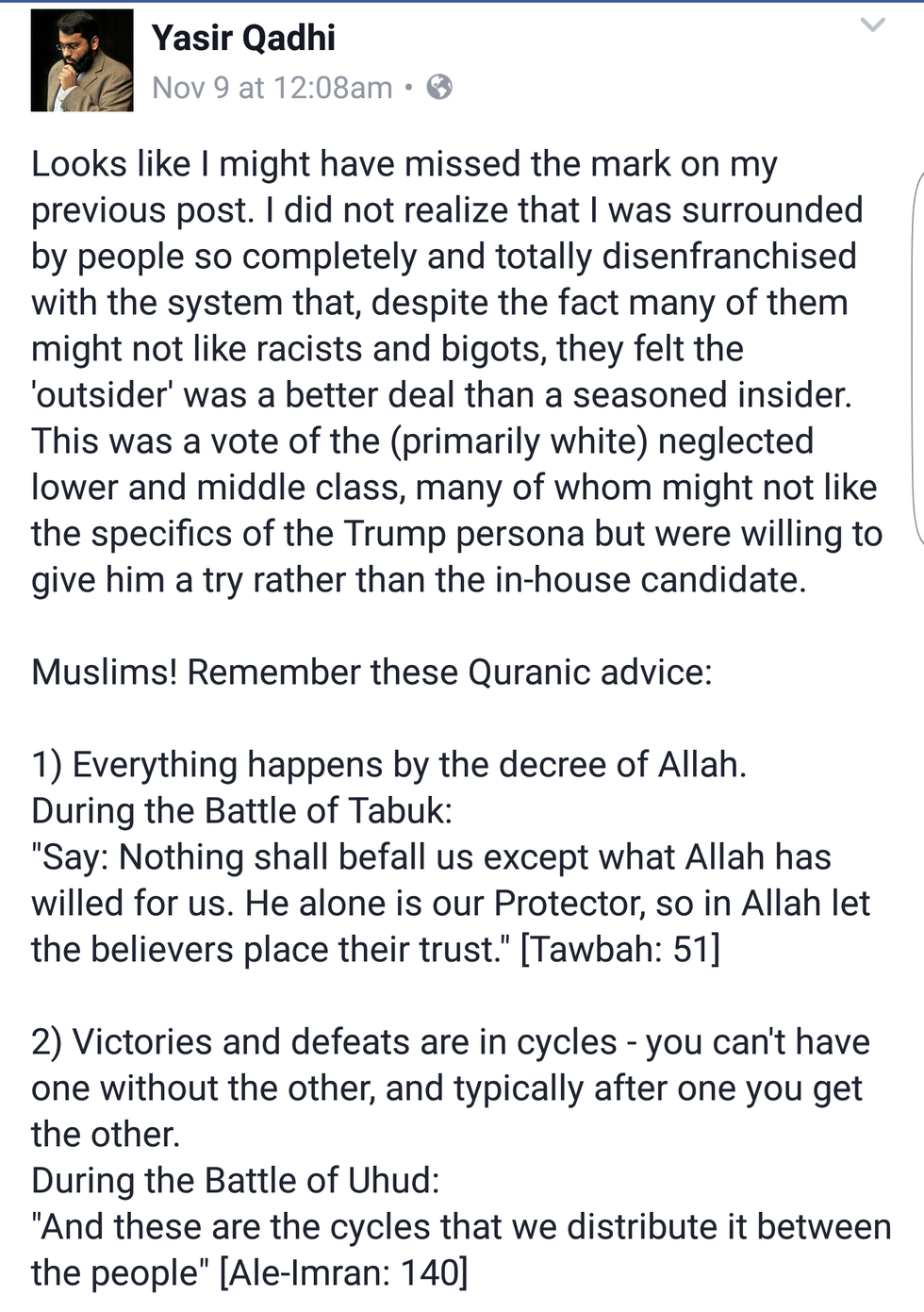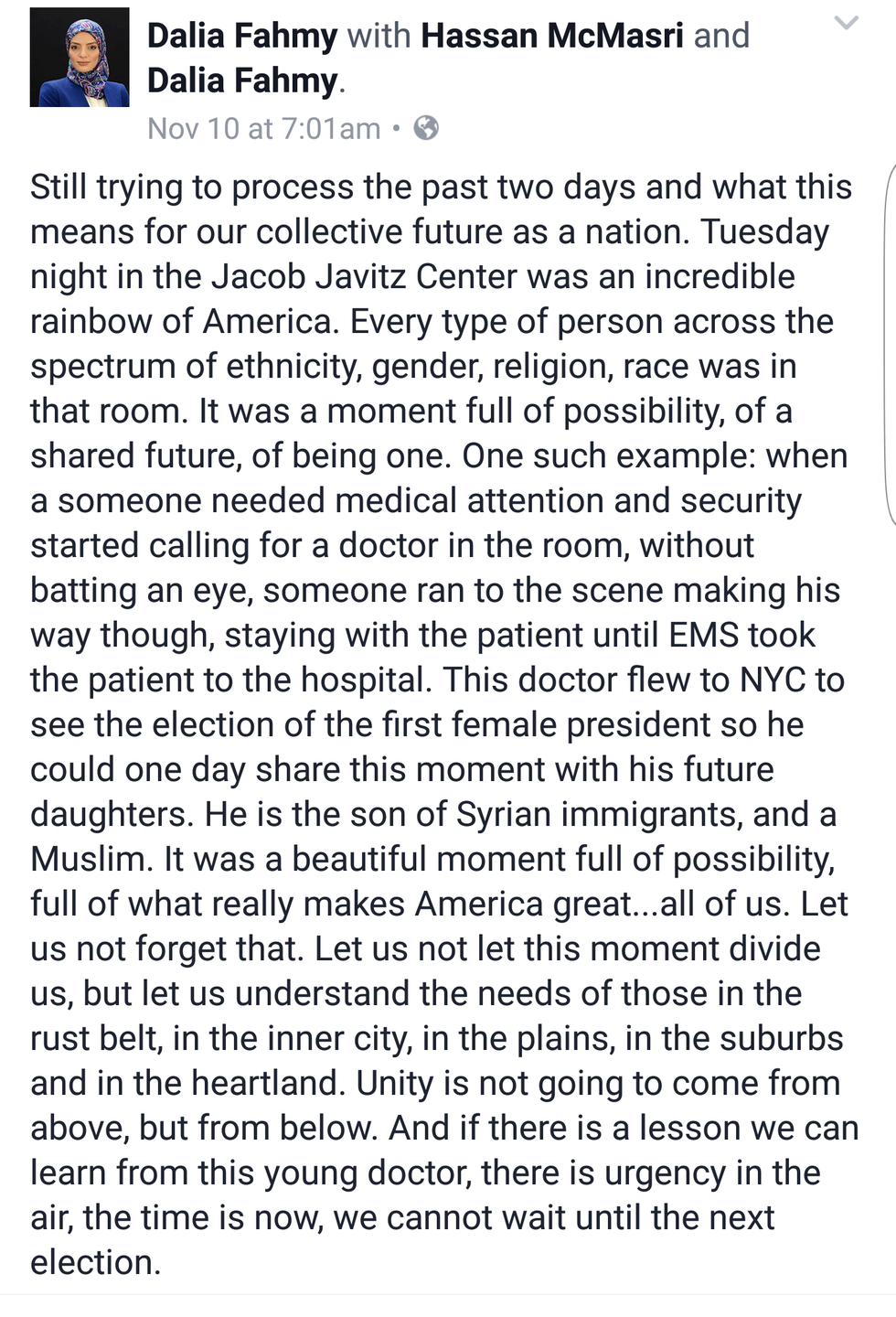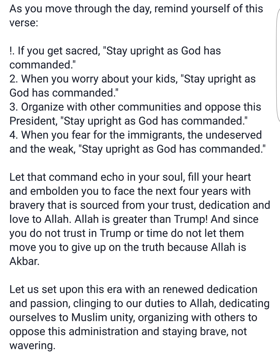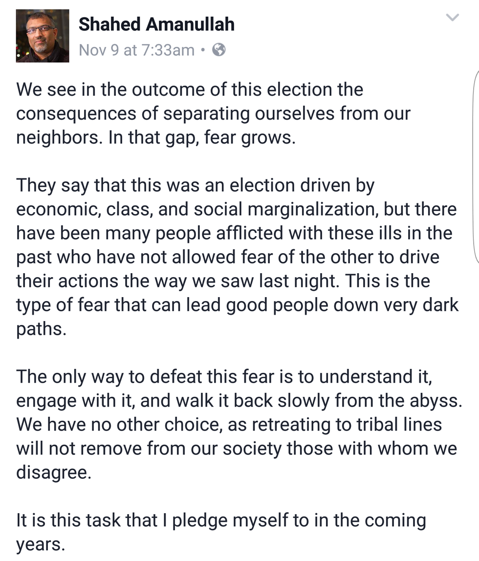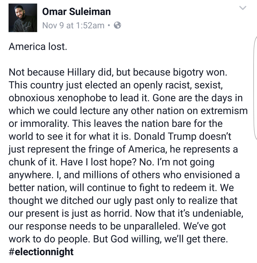 American Muslim leaders and activists inspired feelings of hope and action on social media to move forward as one country. While feelings of despair and anger were apparent, for many Muslim activists and leaders, it was a time to return to the remembrance of God. With hope, determination and absolute trust in God, Muslims analyzed this as a positive situation. They emphasized on the requirement of building communities and bridging gaps, learning from the life of the Prophet (saw) and assessing possibilities to unite as one nation under God.