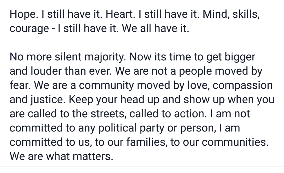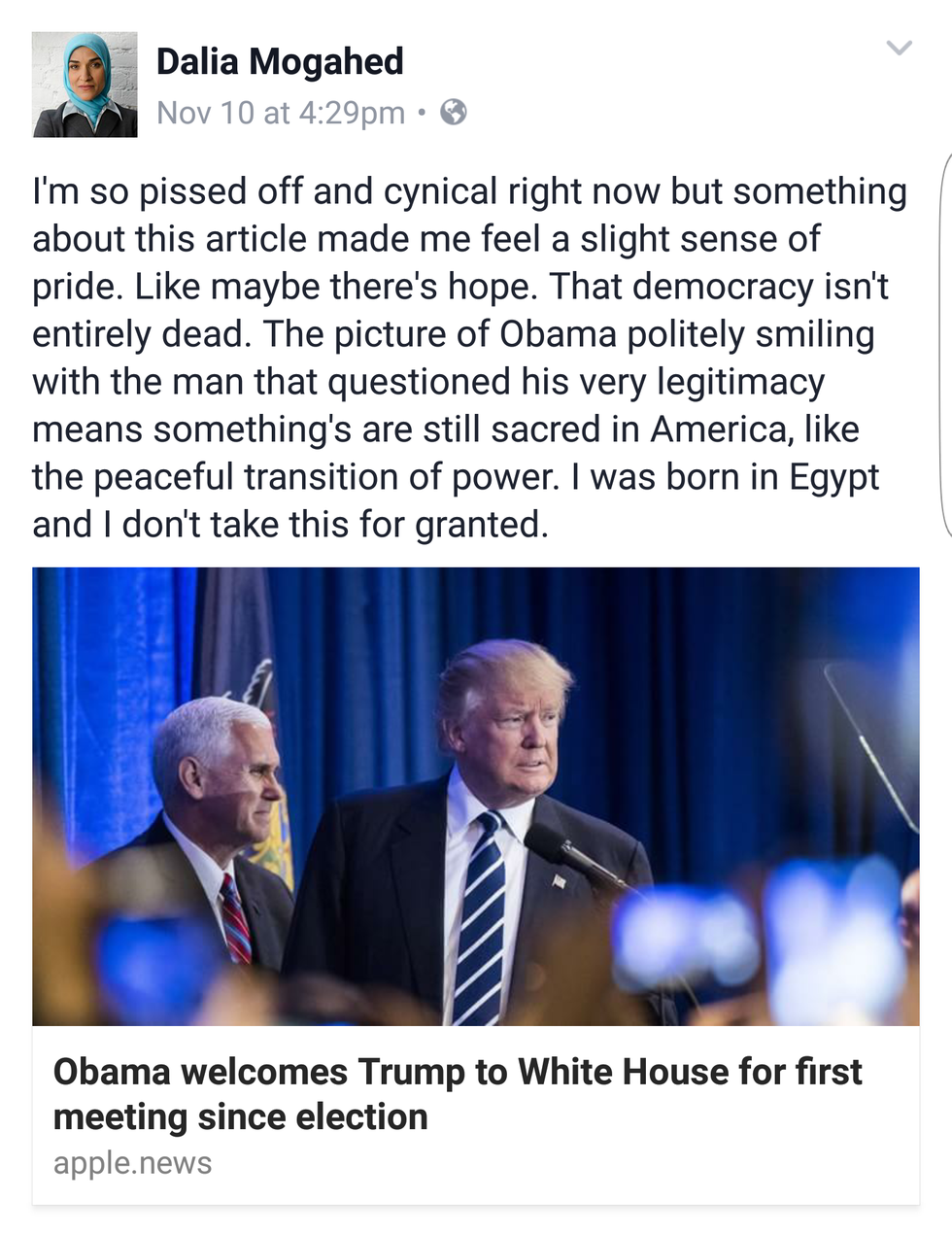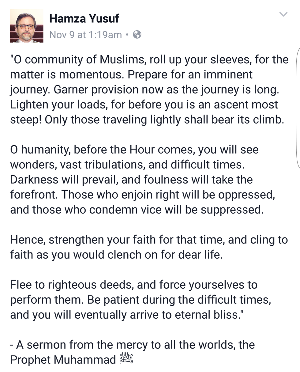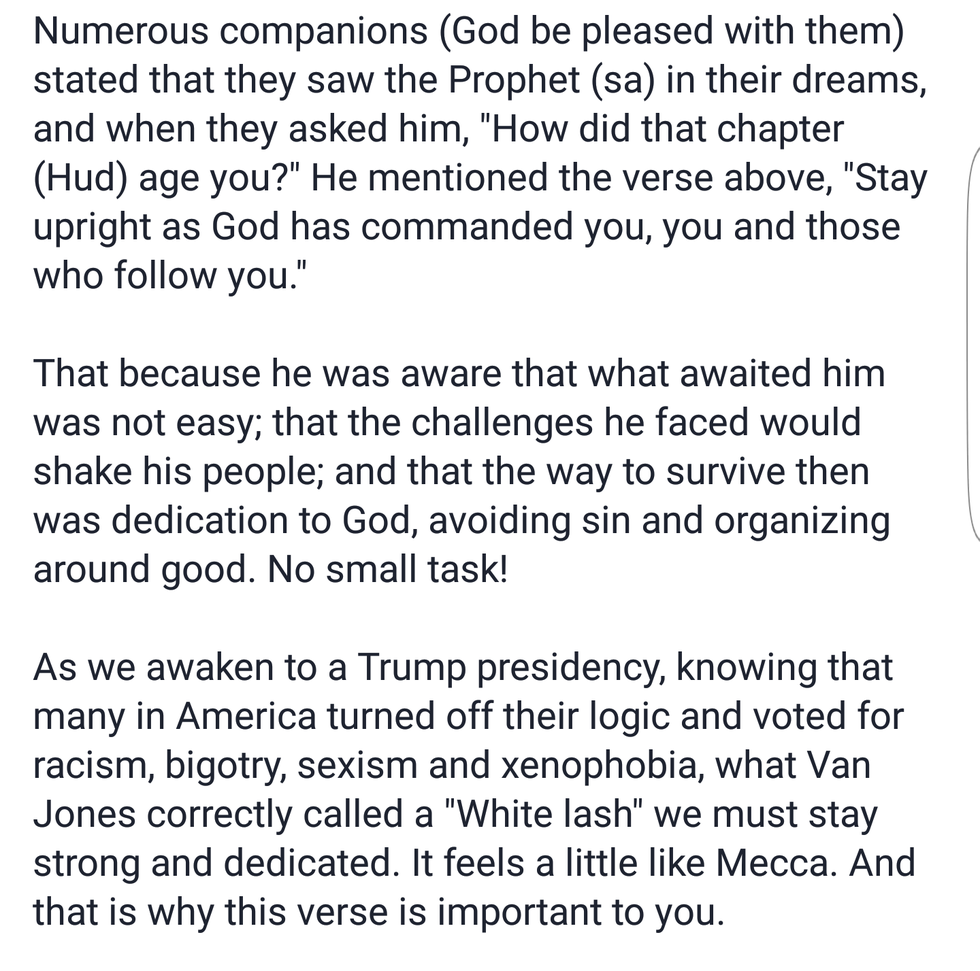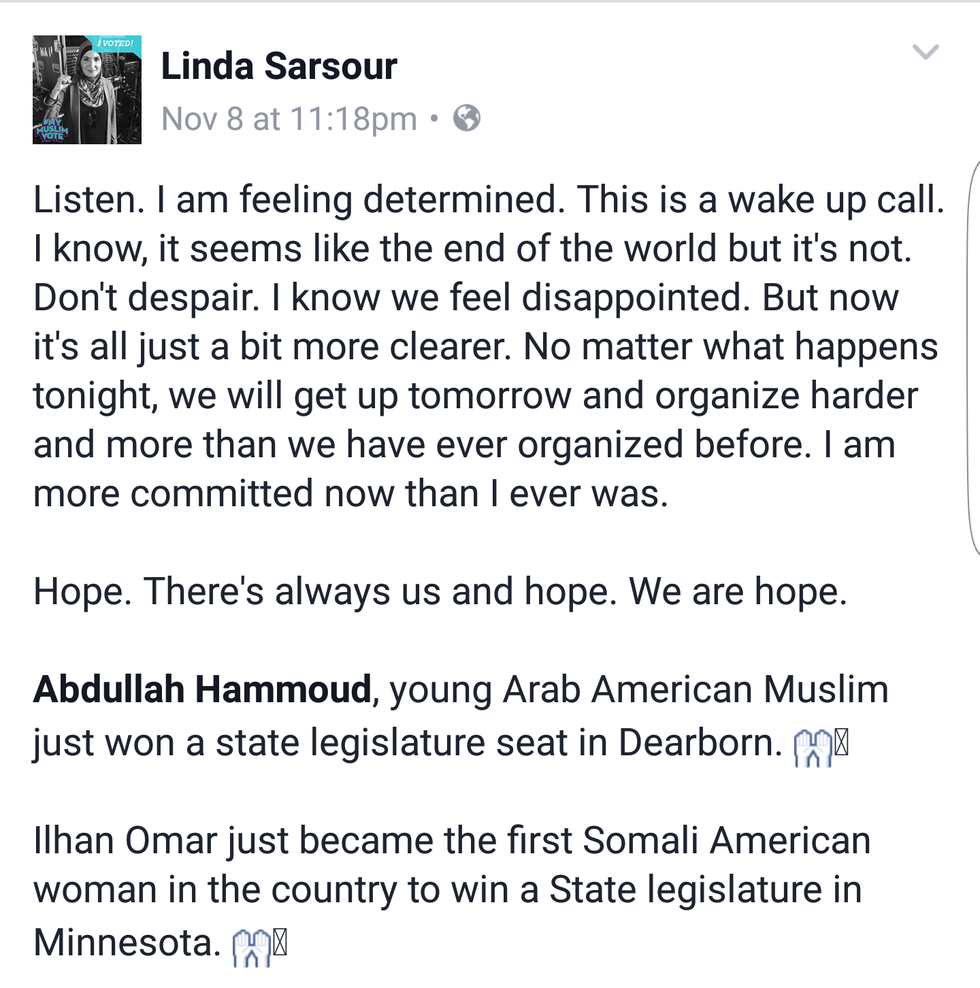 American Muslim leaders and activists inspired feelings of hope and action on social media to move forward as one country. While feelings of despair and anger were apparent, for many Muslim activists and leaders, it was a time to return to the remembrance of God. With hope, determination and absolute trust in God, Muslims analyzed this as a positive situation. They emphasized on the requirement of building communities and bridging gaps, learning from the life of the Prophet (saw) and assessing possibilities to unite as one nation under God.