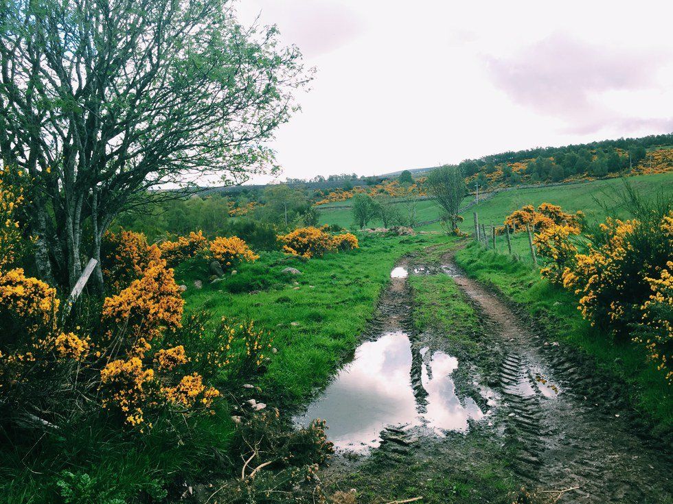 I was running to the back of the train, while it hurried forward. While I did so, I remember looking outside to see the rolling hills that stretched out until they touched the bottom of the blue sky. White little blobs of sheep populated the fields, and vibrant yellow flowers added a splash of extraordinary color: “Gorse,” the people called the flower. The Scottish people once used Gorse for fuel. I watched the countryside roar by me, while I was running towards the direction that we were leaving from. I raced down the aisles as fast as I could, trying to avoid legs that were protruding out into my path, and jumping over straps of carry-on bags that stuck out from their spaces underneath seats. I vaguely remember checking behind me to make sure he wasn’t behind me. He wasn’t. Sophie was trailing close behind. I reached my hand back and she grabbed it as we plunged into the bathroom and shut the door behind us.