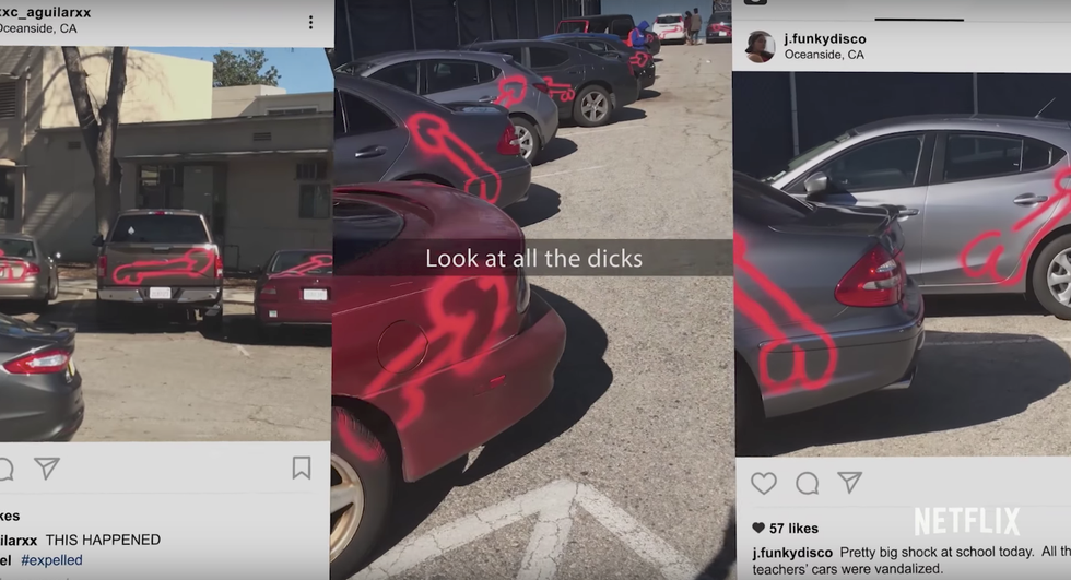 Banking on the success of "Making a Murderer," and "The People V. OJ Simpson," "American Vandal" takes all the tropes that make a good true crime story and flip it on its head, telling a compelling suspenseful story about a mystery inside of a high school. On March 15, 2016, all the cars in the faculty parking lot of this high school were vandalized, spray-painted penises on the side of each vehicle. The school immediately has a suspect, but two kids Peter and Sam set out to film a documentary trying to figure out the truth behind it.