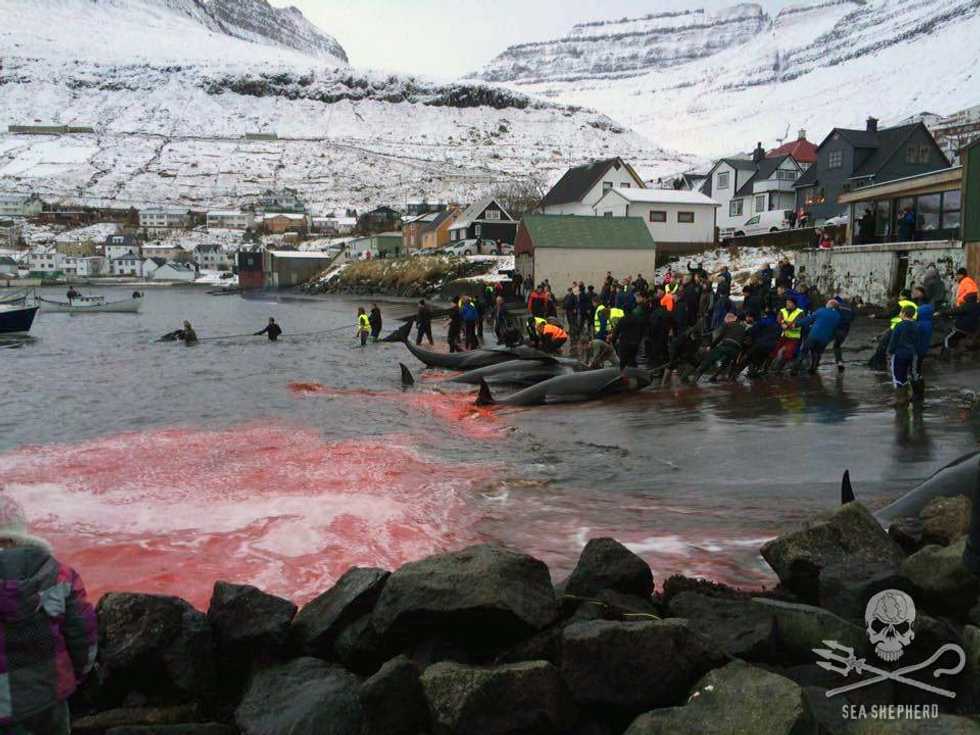 This slaughter is during the months of July-August. It begins by approaching the pod with boats that form a half- circle behind the pod. Then, they throw small rocks attached to rope into the water to create a wall of bubbles which reflects the sonar of the pilot whale this works to harass and frighten the whales towards a low- lying shore until they wash up to shore.