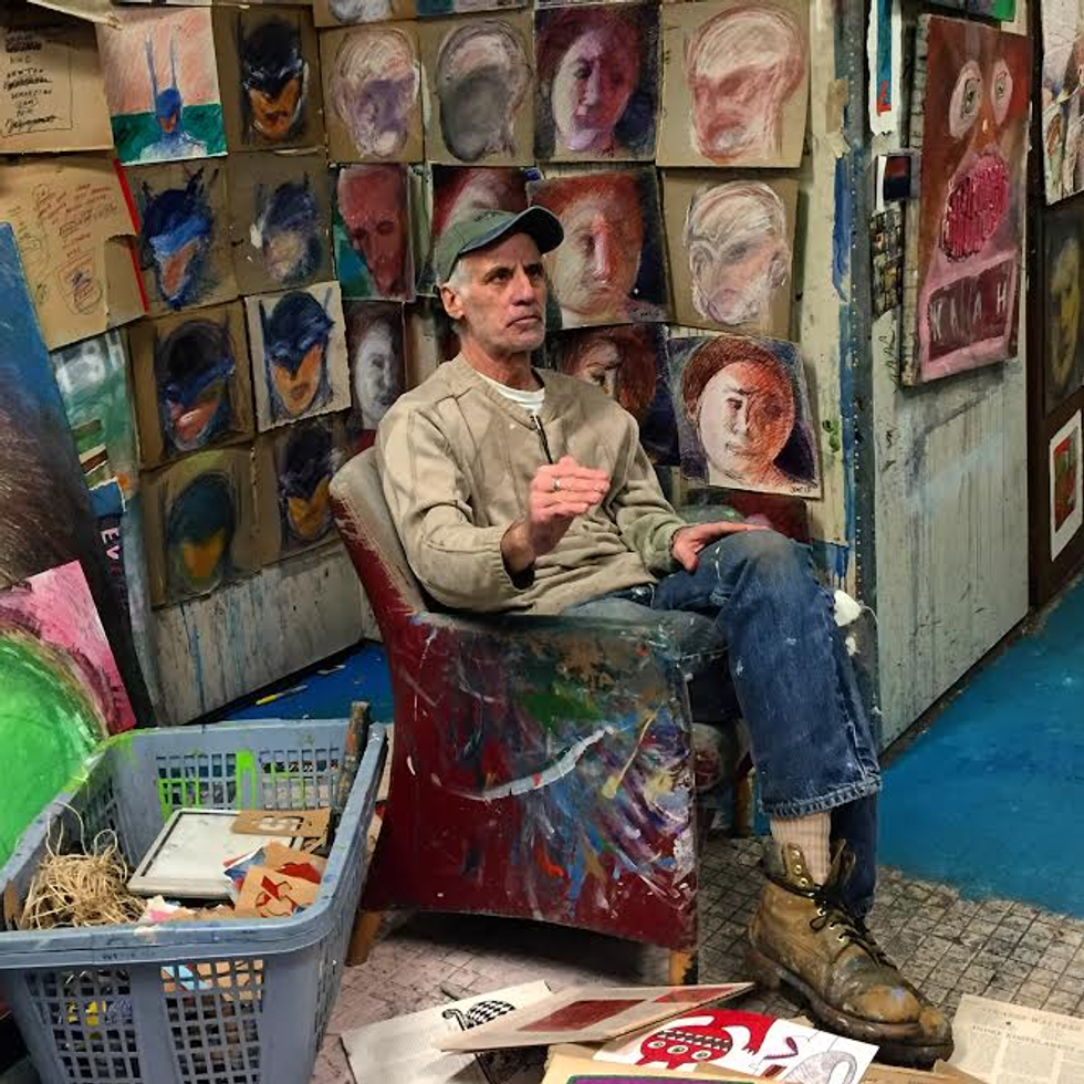 Jon Sarkin, as we entered his studio that tightly fits about 15 people, sat in a busted up red leather chair, nearly unrecognizable from the paint splatters that cover it. A contemporary artist with a striking personality, each 12x12 drawing surrounding him on the wall is a piece of who he has become.