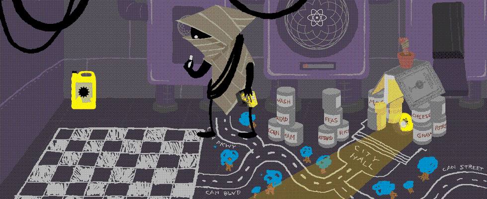 Starting from that simple premise (which even itself isn't evident from the beginning), the story manages to become incredibly convoluted, folding in many disparate plot lines, such as a strange wanderer building a town out of cans: