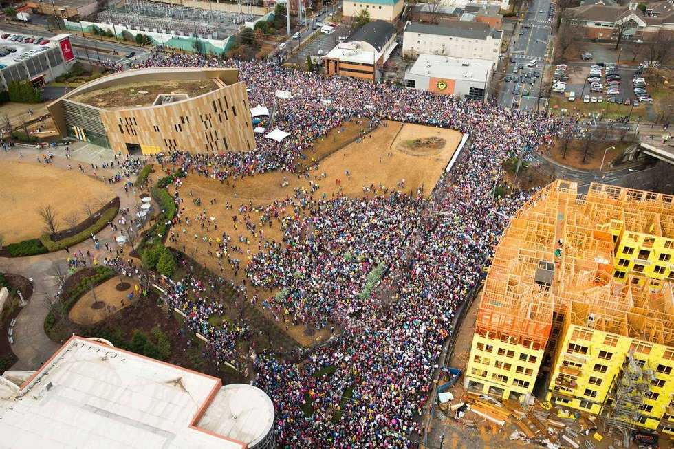 We exited the station into a very windy and rainy downtown Atlanta, and made our way the the start point by the National Center for Civil and Human Rights. My mom and I waited on a street corner whilst being buffeted about a fair amount by those around us (we are rather short and not particularly assertive). As we were far from the building itself, we unfortunately could not hear any of the speakers, but we entertained ourselves by reading everyone’s shirts and signs, as well as laughing at the odds of the fact that at one point I spotted one of my high school teachers in the crowd. After about half an hour, the whole crowd had turned to left as if ready to start the march, and it took another half hour from there for the crowd to move down one block.