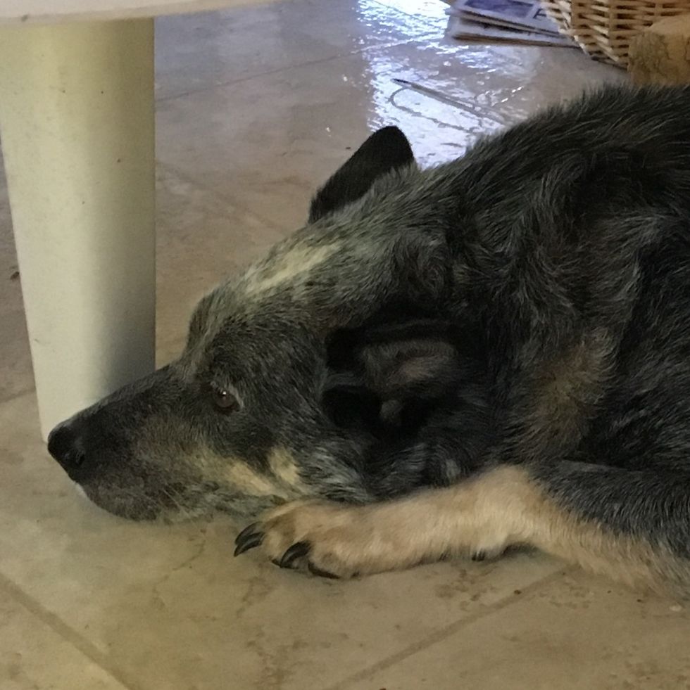 Baby’s unique style of running--looking like a sausage forging full speed ahead and throwing her humongous ass to the right as she took each step--made her a most significantly successful herder, as Blue Heelers are known to be; however, Baby only saw purpose in herding her sister, Charli, and was in fact once returned by a farmer who tried her out as an employee and accurately accused Baby of being “real nice but not really good for nothin’.” It was discovered that Baby could not swim during one of these sessions of herding Charli. Baby, deciding that Charli was unsafe in the treacherous waters of some backwoods creek, went past her in the murky water, plunging forth until she became invisible and did not arise. Her mother, Alley, gripped her by her rippling back fat and pulled her back to the world of the living-but-not-swimming. As she was drowning and as she was rescued, Baby, per usual, was grinning.