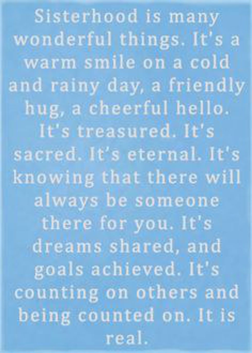 After the passing of one of my sorority sisters/best friends, I learned the true meaning behind sisterhood. I would not have made it through that semester as easily as I did if it weren't for my sorority sisters supporting me through everything and sticking by my side. From the cards I received, to always having someone to cry with when I was feeling down, to always getting a text from a sister checking in to see if I was doing okay, Greek life has had a huge impact on my life.