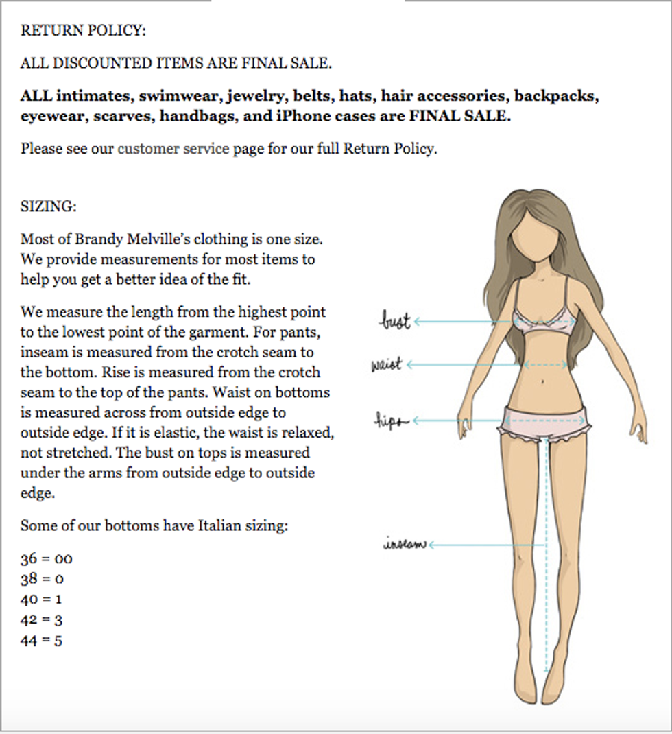 The average dress size for an American teenage girl today is size 8. Just a few minutes on your website, BrandyMelvilleUSA.com, makes evident the fact that you are making virtually no attempt to include average women. Many products are one size, with that size being “X-Small to Small.” I couldn’t find a single pair of pants bigger than a size 27 (or a size 4 in American sizes). To top it all off, your size chart for Italian sizes only goes up to a size 5. Size 5. At least you are transparent about it.